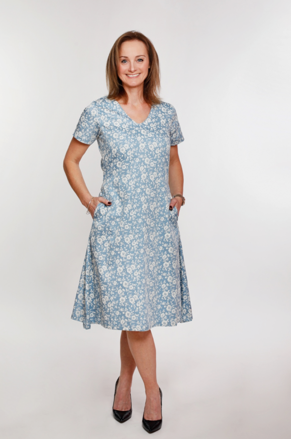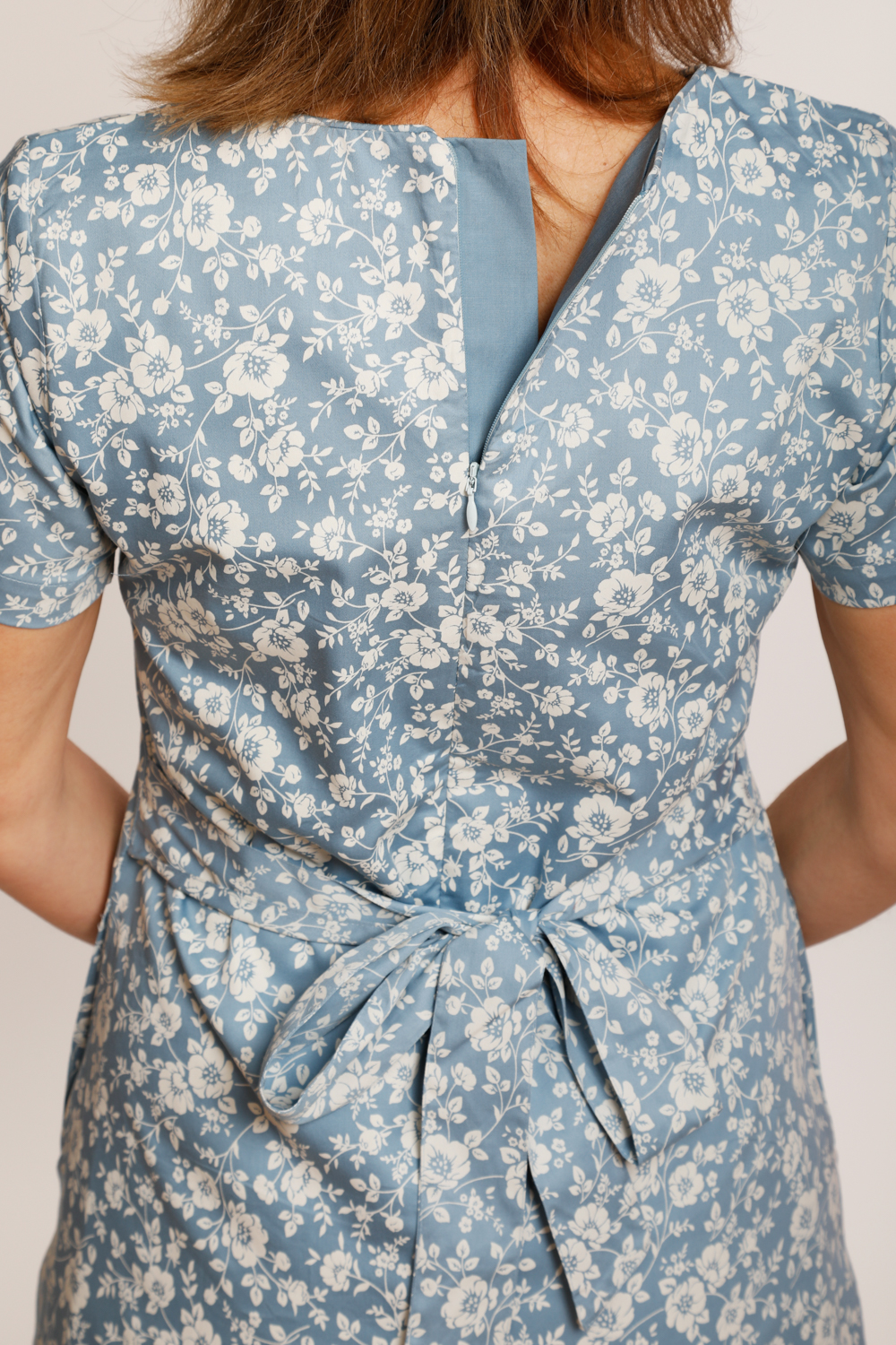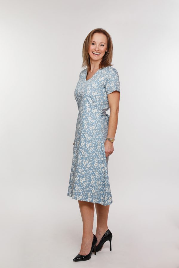 Roses are an essential part of country gardens. We have captured the beauty of English roses with our Yorkshire rose print on a contrasting pastel blue background. This elegant and fluid styled dress is designed to flatter with a self-fabric tie to accentuate.