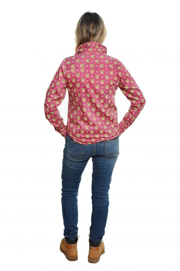 Beautiful burnt pink background sporting sharp leopards in a polka layout.